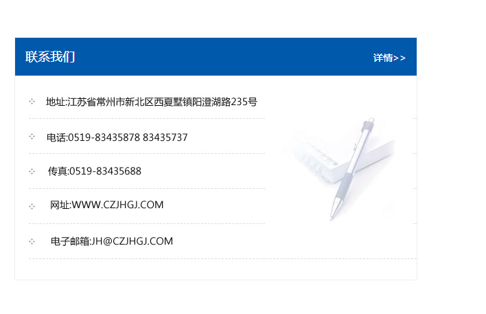 地址:常州市新北區友邦商務大廈1幢16、17層  電話:0519-85101652  傳真:0519-85112595  郵編:213022  網址:www.cz-jiayue_cn.zuoguidna.com  郵箱:xiajifengaa@163.com